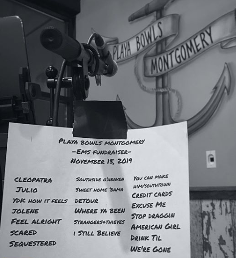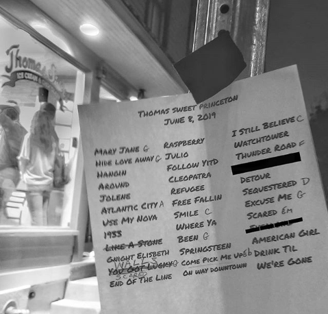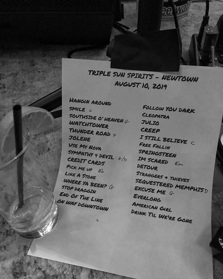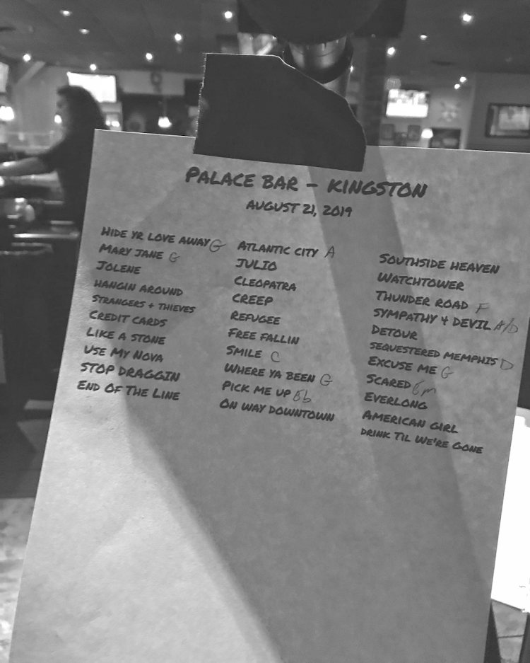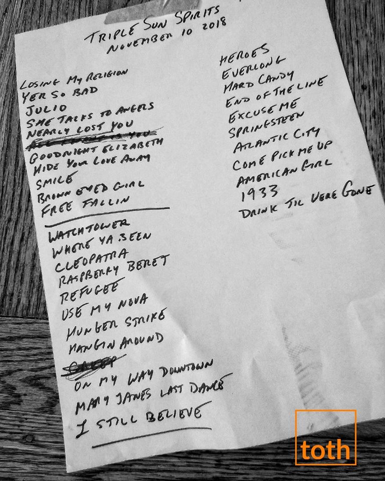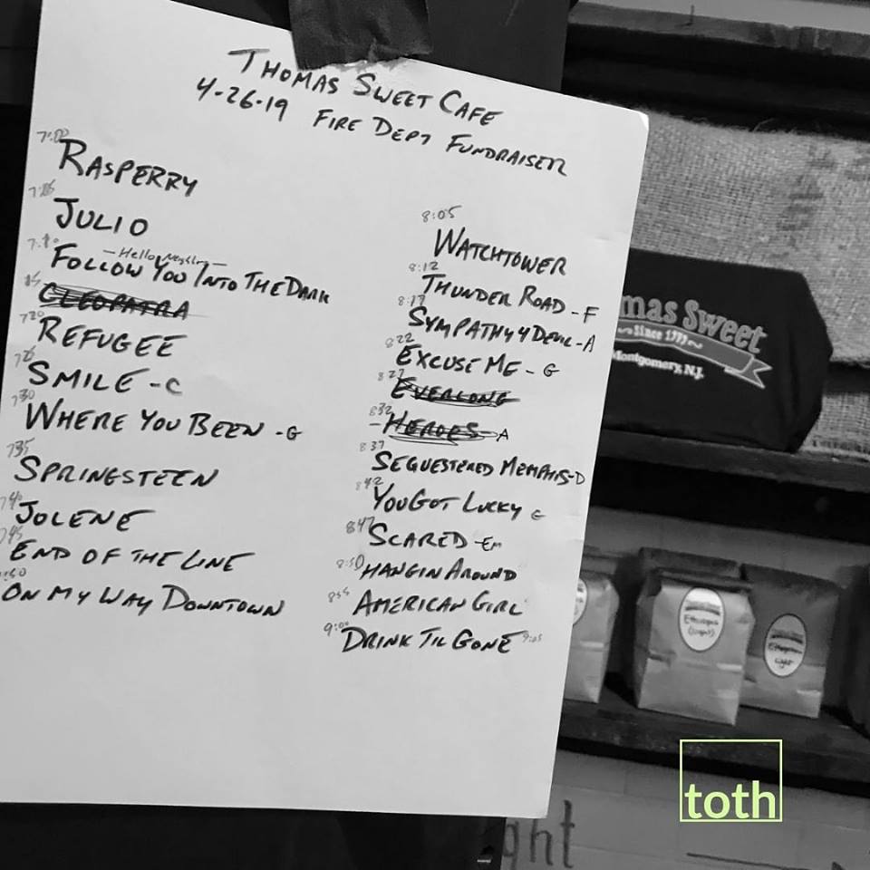 all along the watchtower - bob dylan excuse me while i break my own heart tonight - whiskeytown me and julio down by the schoolyard - paul simon raspberry beret / billie jean - prince / michael jackson use my nova - toth all i want is you - u2 where've you been? - toth free fallin - tom petty mary jane's last dance - tom petty american girl - tom petty 1933 - frank turner