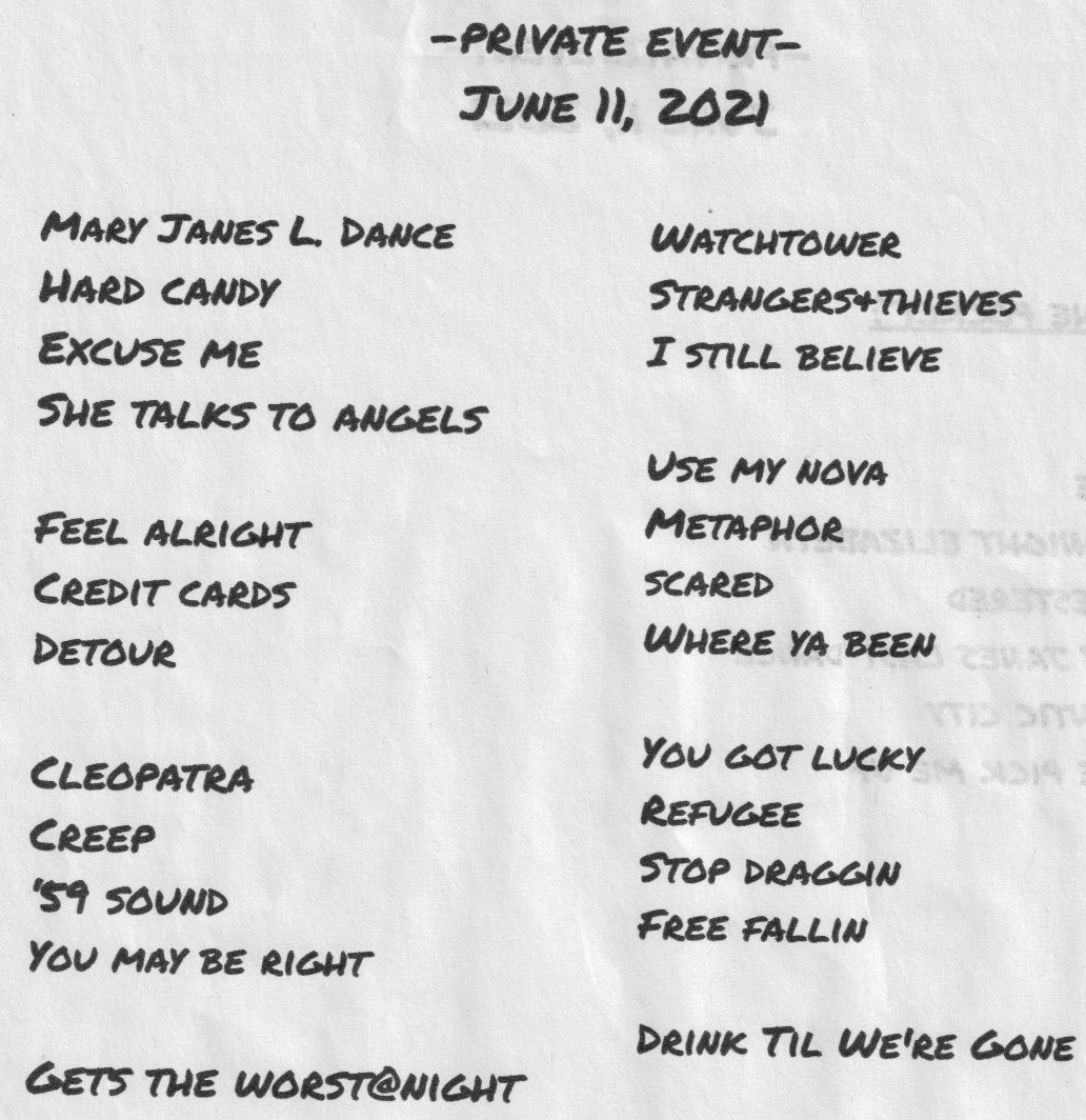 goodnight elisibeth - counting crows atlantic city - bruce springsteen mary jane's last dance - tom petty raspberry beret / billie jean - prince / michael jackson excuse me while i break my own heart tonight - whiskeytown
